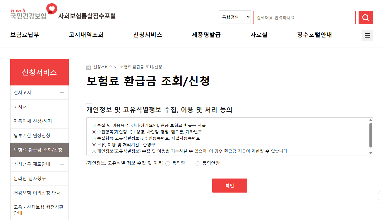홈페이지 메뉴 상단의 ‘개인민원’ → ‘보험료 조회/납부’ → ‘보험료 환급금 조회/신청’ 항목에서 환급 여부를 확인할 수 있습니다.