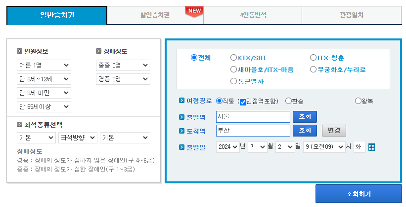 - 출발지(서울)와 도착지(부산) 선택